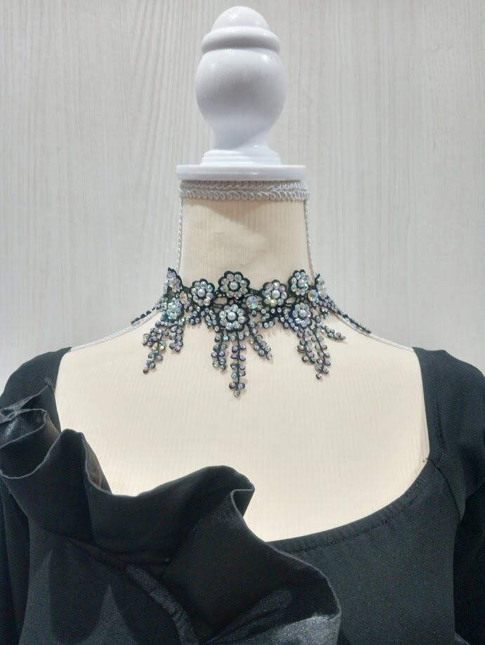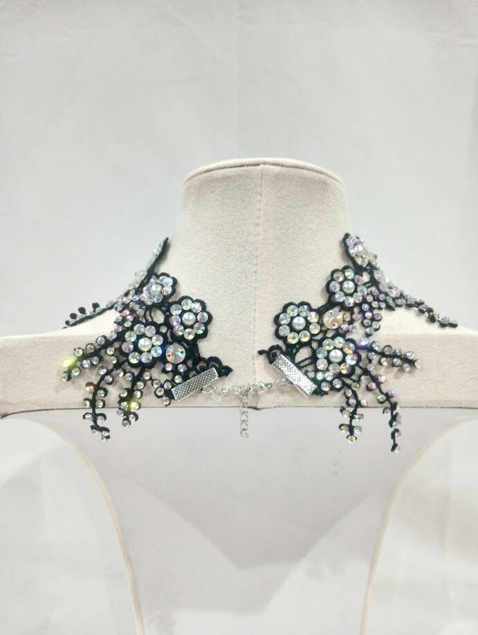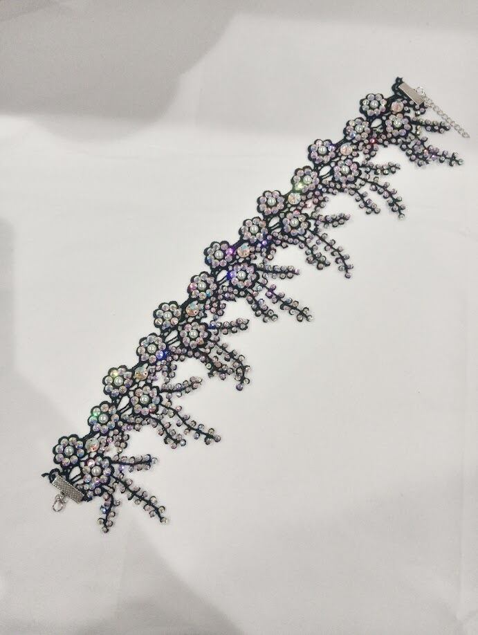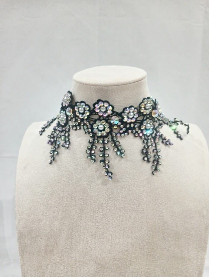 無数のラインストーンが贅沢にあしらわれた、華やかで存在感のあるチョーカー。光の角度によって美しく反射し、首元をドラマチックに演出します。パーティーやステージ、特別な日のコーディネートにぴったりのアイテムです。