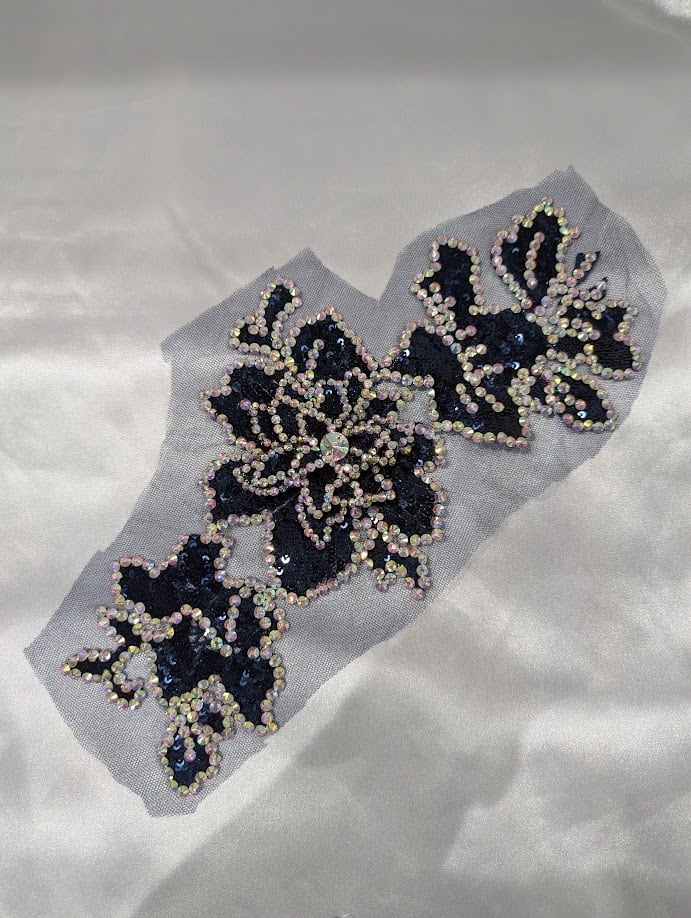 繊細なレースの上に、スパンコールとオーロラストーンを贅沢にあしらった立体的なフラワーモチーフ。