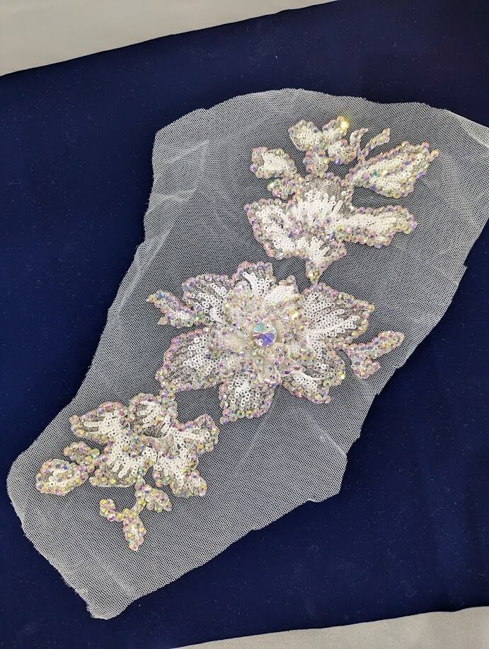 繊細なレースの上に、スパンコールとオーロラストーンを贅沢にあしらった立体的なフラワーモチーフ。