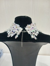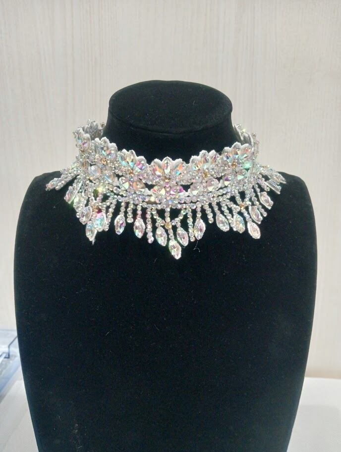 レースにラインストーンが贅沢にあしらわれており。首元で美しく輝きます。動くたびに光を反射するラインストーンがダンスシーンや照明の下で一層、存在感を放ちます。