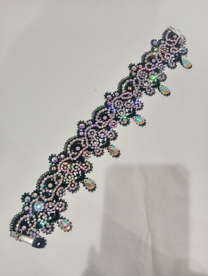 レースにラインストーンが贅沢にあしらわれており。首元で美しく輝きます。動くたびに光を反射するラインストーンがダンスシーンや照明の下で一層、存在感を放ちます。