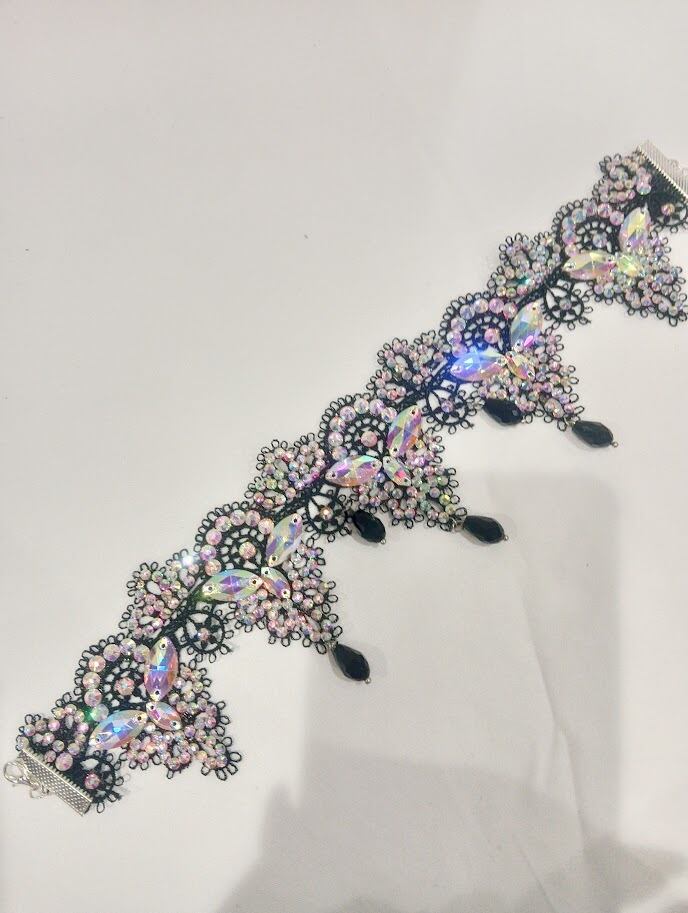 レースにラインストーンが贅沢にあしらわれており。首元で美しく輝きます。動くたびに光を反射するラインストーンがダンスシーンや照明の下で一層、存在感を放ちます。