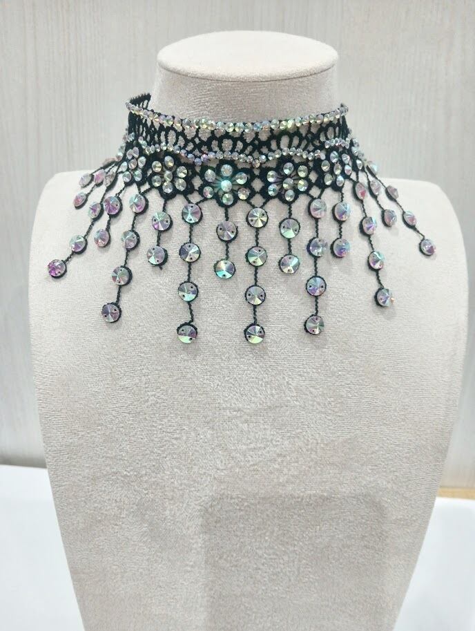 レースにラインストーンが贅沢にあしらわれており。首元で美しく輝きます。動くたびに光を反射するラインストーンがダンスシーンや照明の下で一層、存在感を放ちます。