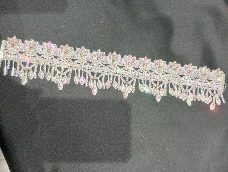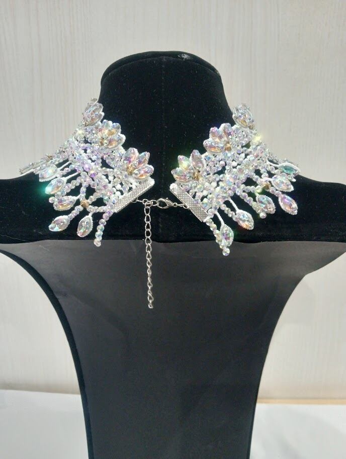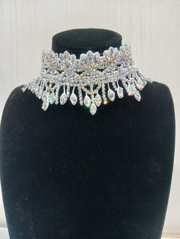 レースにラインストーンが贅沢にあしらわれており。首元で美しく輝きます。動くたびに光を反射するラインストーンがダンスシーンや照明の下で一層、存在感を放ちます。